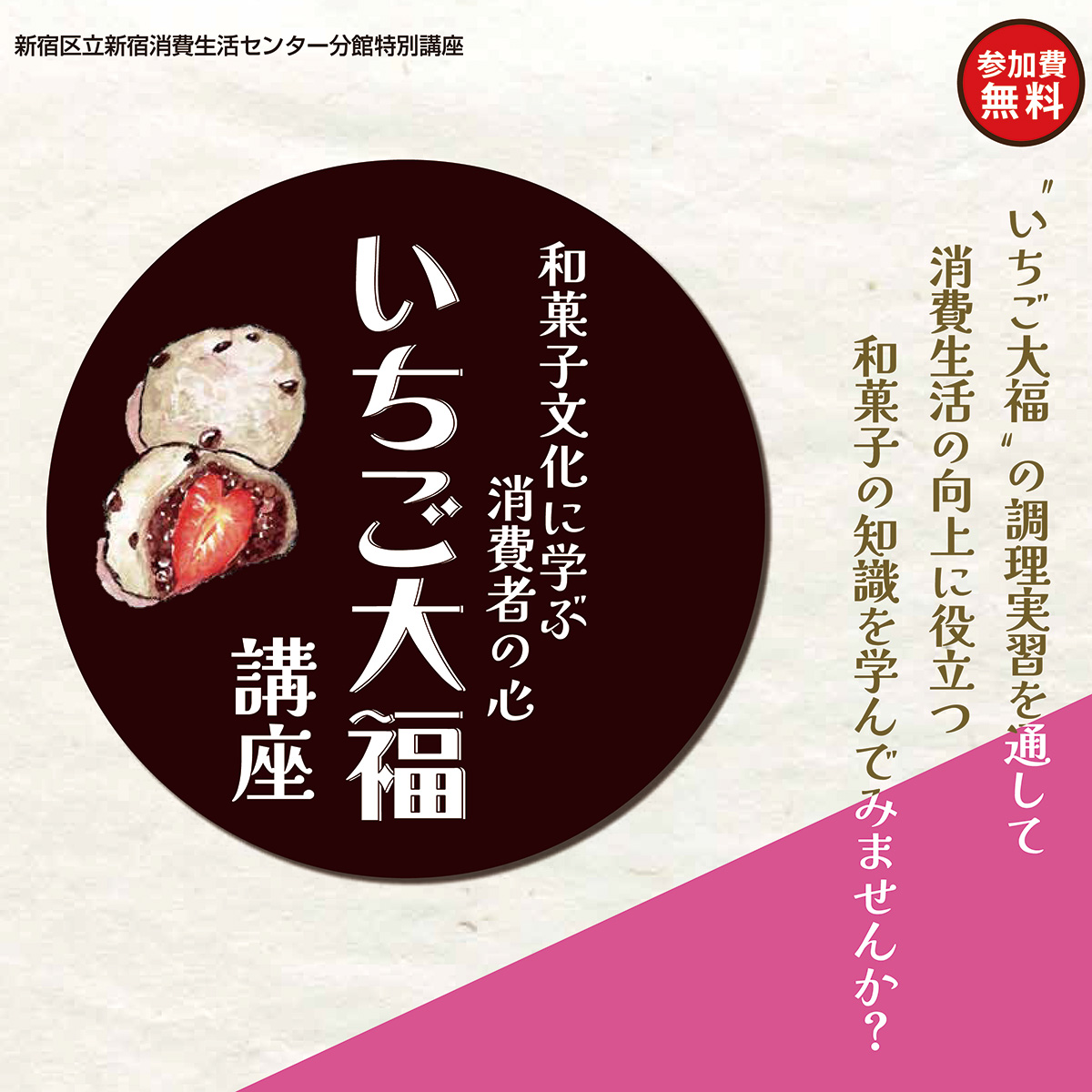 下記、いちご大福講座がご好評により、 2月と同内容で 3月26日(日)いちご大福講座 を実施すること になりました。 詳細・お申し込みは、 新宿区立消費生活センター分館へ。 ~~~~~~~~~~~~~~~~~~~~~~~~~ 2月12日(日)和菓子初心者講座 いちご大福講座 ; 新宿区消費生活センター分館 2023 1/23 お知らせ 2023.01.23 2023.03.03 お知らせ よかったらシェアしてね! URL Copied! URL Copied! 7月28日(水)杉並区中学校食育研究会和菓子講座実施;杉並区立東原中学校 9月和菓子づくりをたのしむ会:おはぎ 関連記事 コロナ感染症対策のため活動を中止しています 2021.07.10 2024 10月 和菓子づくりをたのしむ会 ; 中野区委託事業 2024.11.03 令和6年度 中野区放課後子ども教室推進事業 和菓子づくりをたのしむ会 2024.04.26 7月28日(水)杉並区中学校食育研究会和菓子講座実施;杉並区立東原中学校 2021.07.25